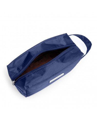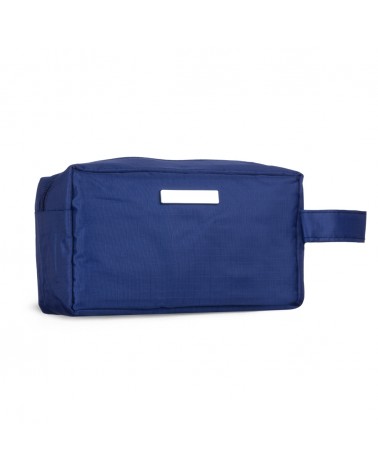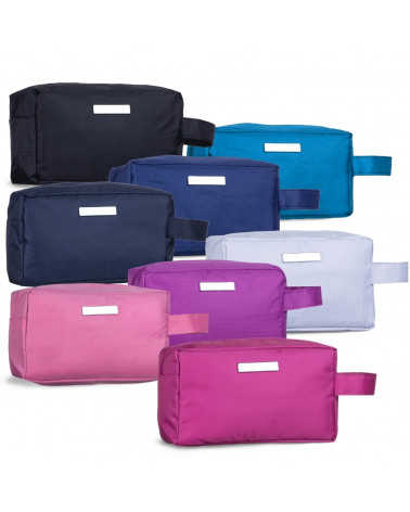 Necessarie tecido poliester, cursor duplo para fechamento com alça, trava com velcro, alça de mão, gravação Frontal.