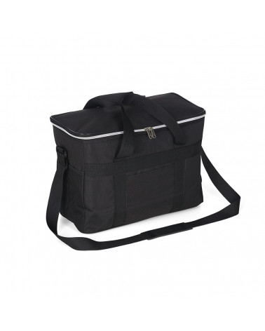 Bolsa térmica 33 litros. Contém bolso frontal, bolsos laterais telados, alça de mão em nylon e alça transversal regulável (não removível) com apoio para ombro.
