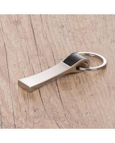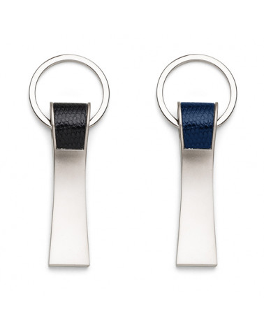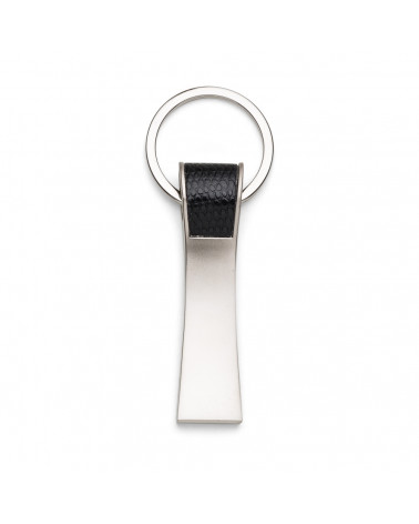 Chaveiro metálico com detalhe em couro sintético.