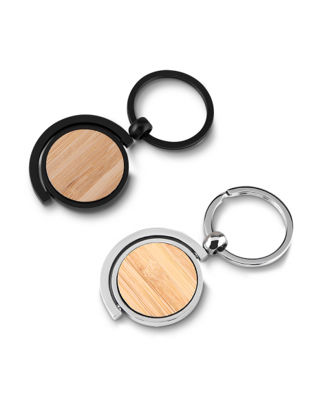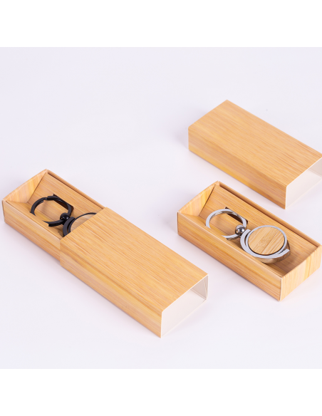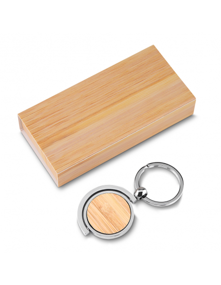 Chaveiro de metal com detalhe em bambu. Acompanha estojo em papelão imitando bambu.