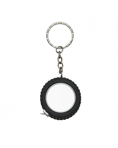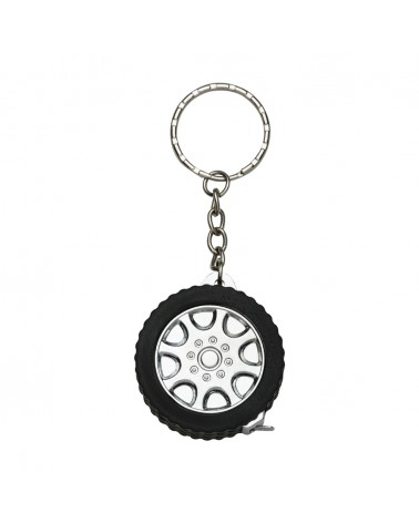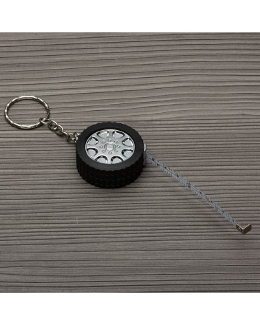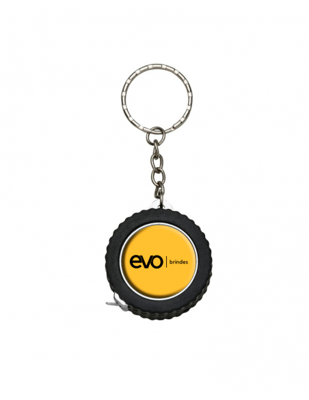 Chaveiro plástico com detalhes emborrachados em formato de pneu , com trena de 1 metro