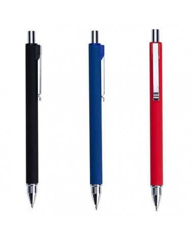 Caneta de alumínio com revestimento emborrachado e detalhes prata.