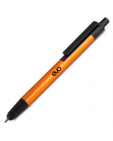 Caneta esferográfica em metal com mecanismo twist e clipe com detalhe brilhante na ponta.