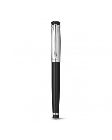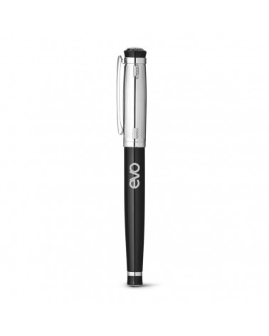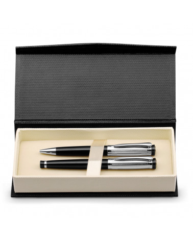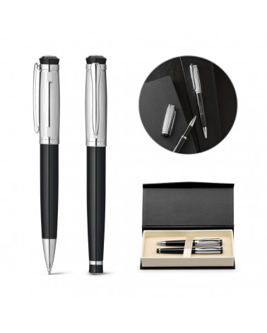 Conjunto de roller e esferográfica em metal com clipe. Fornecido em estojo almofadado.