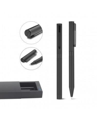 O AUTOGRAPH é um conjunto sofisticado de esferográfica e roller. O roller é em metal com acabamento preto mate e tampa com clipe em aço inox e a esferográfica é em metal, com acabamento preto mate e clipe em aço inox.