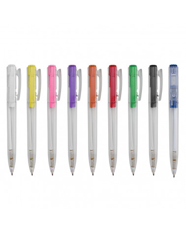 Caneta plástica com carga esferográfica azul e acionamento por clique.