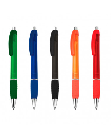 Lapiseira plástica prata com detalhes coloridos translúcidos.