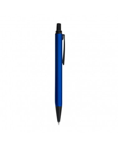 Caneta metálica triangular com carga esferográfica azul e acionamento por clique.