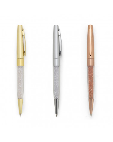 Caneta semimetálica com detalhes em cristal, carga esferográfica azul e acionamento por rotação.