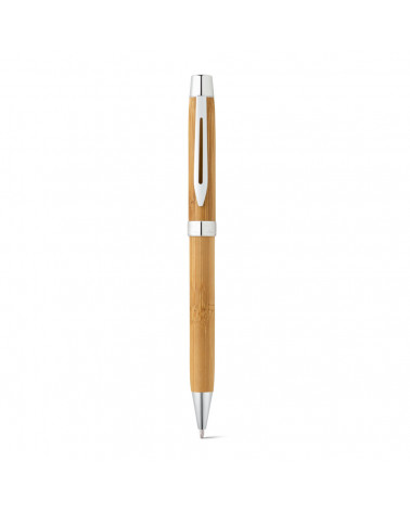 Esferográfica em bambu com mecanismo twist e clipe em metal. Fornecida em estojo de bambu.