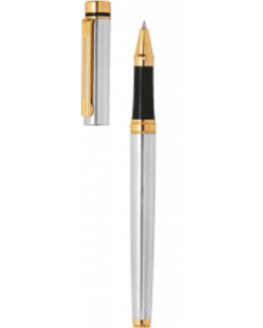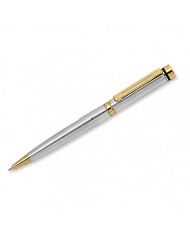 Caneta metálica com detalhes dm dourado.