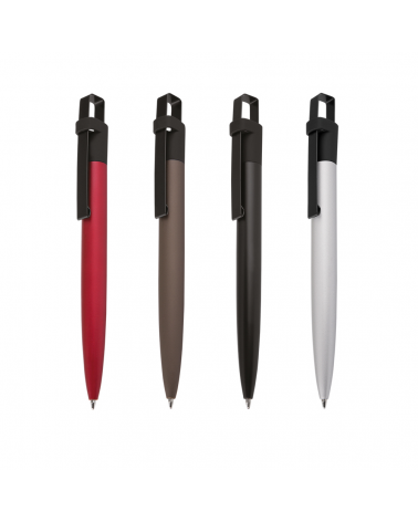 Lapiseira plástica prata com detalhes coloridos translúcidos.