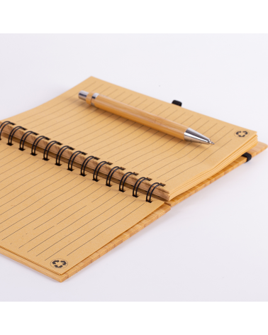 1 Caderno de anotações 18x13,5cm capa de bambu, com elástico, suporte para canetas e miolo com 70 folhas pautadas na cor bege; 1 Caneta de bambu com partes em metal.