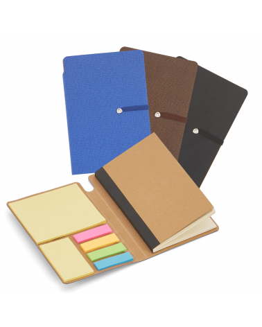 Bloco de anotações com elástico, sticky notes, miolo sem pauta na cor bege.