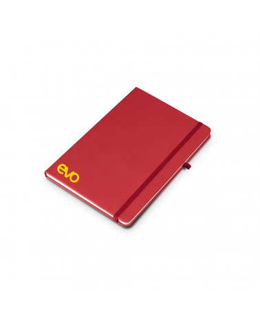 Caderno de anotações com elástico, suporte para caneta, capa dura em material sintético, miolo 80 folhas pautadas.