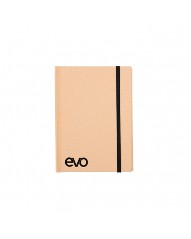 Bloco de Anotações Ecológico, material em kraft. Frente e verso liso com fita elástica para fechar.