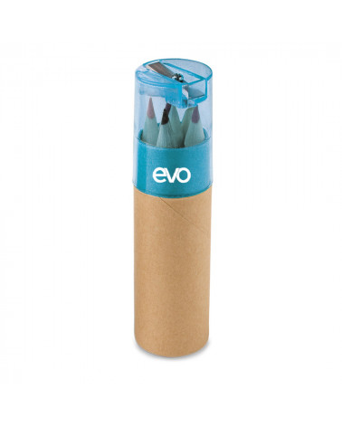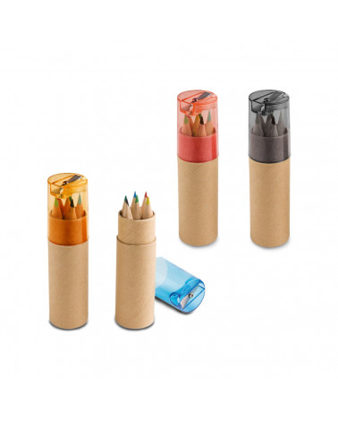 Caixa cilíndrica em cartão com 6 mini lápis de cor. Incluso apontador. ø26 x 103 mm.
