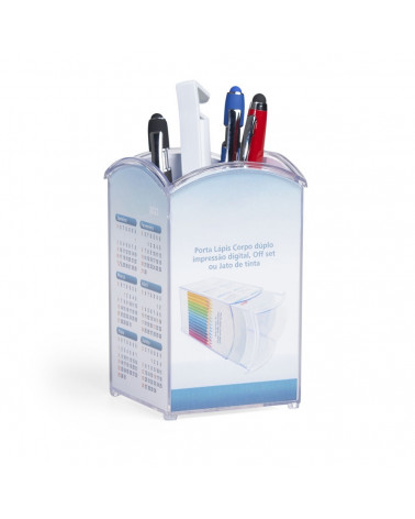 Porta canetas em acrílico de corpo duplo com porta fotos.
