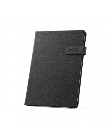 Agenda B5 em rPET. Agenda com presilha em PU com fecho magnético e suporte para esferográfica.