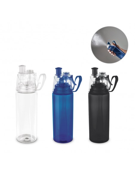 Squeeze em PS e tampa em ABS com bico "push-pull". Incluso vaporizador, alça para facilitar o transporte e capacidade até 600 mL. Certificação EU Food Grade. Caixa branca 94657 vendida opcionalmente.