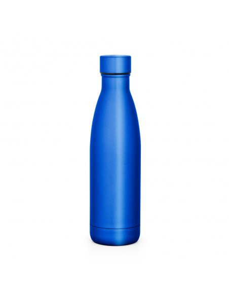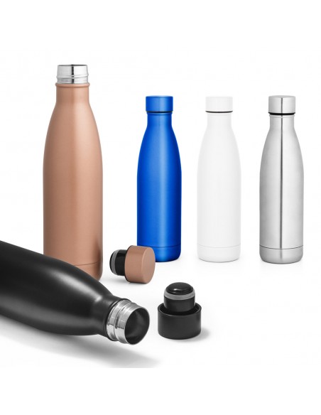 Squeeze em aço inox com parede dupla e tampa com sistema de vácuo (térmico). Capacidade até 500 mL.