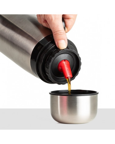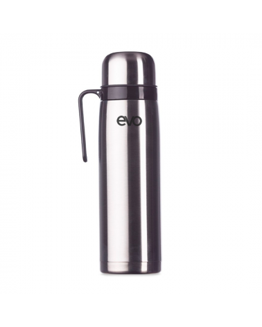 Garrafa térmica com capacidade de 1 litro em inox com parede dupla.