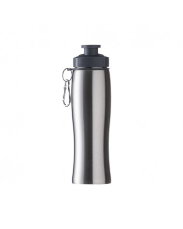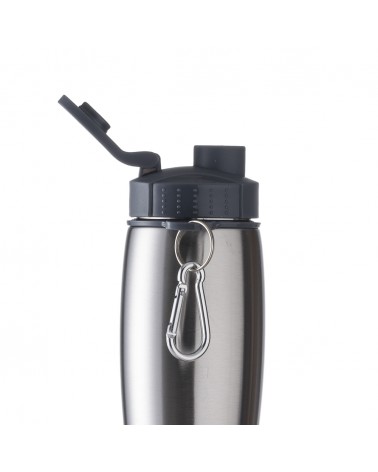 Garrafa metálica 750 ml com mosquetão e fundo emborrachado.