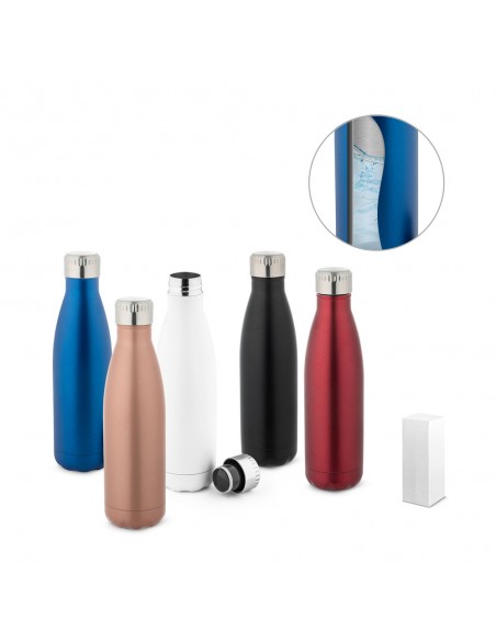 Squeeze em aço inox com parede dupla isolada a vácuo, capacidade até 540 mL e tampa à prova de fugas (térmico). Certificação EU Food Grade. Preserva as bebidas quentes por 8h e frias por 24h.
