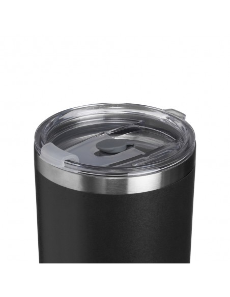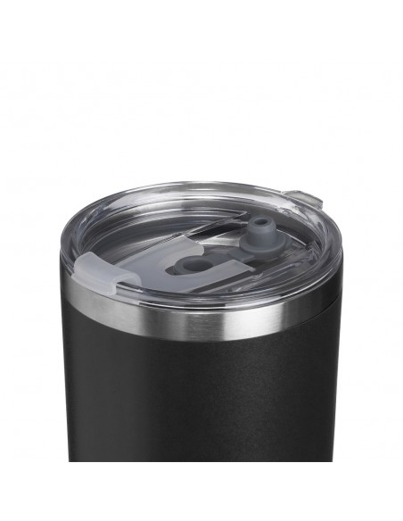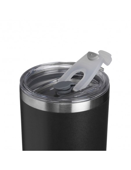 Copo térmico de inox com capacidade de 550ml, contém tampa acrílica com bocal e trava de segurança e uma pequena tampa emborrachada para dissipação da temperatura.