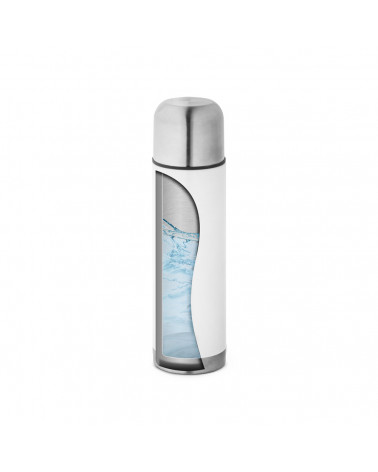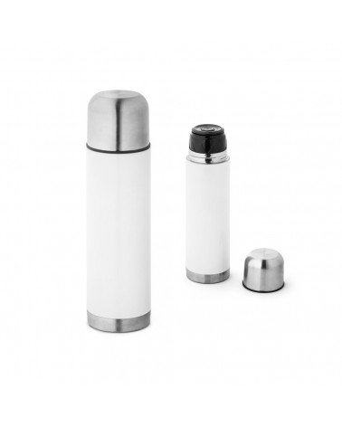 Garrafa térmica com capacidade de 1 litro em inox com parede dupla.