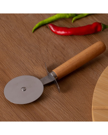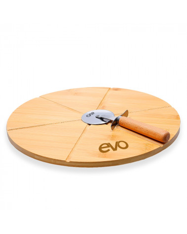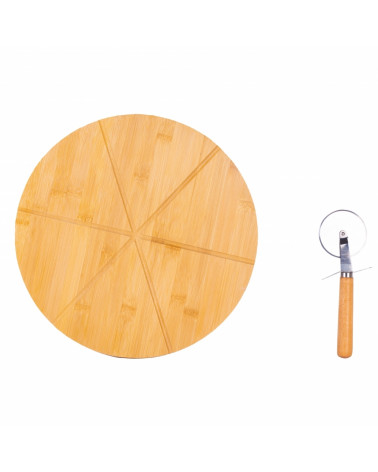 Kit pizza 2 peças, contém: tabua de bambu com relevo em formato de pedaços de pizza, e cortador de pizza de inox com cabo de madeira.