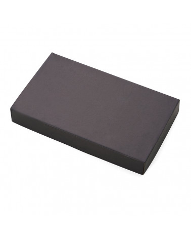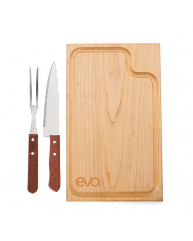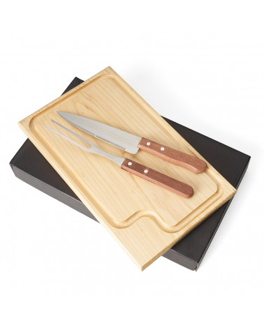 Kit churrasco três peças em estojo de papel kraft, contém: faca, garfo e tábua de corte com canaleta.