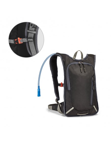 A mochila inclui um reservatório de água com capacidade até 2 L e canudo.