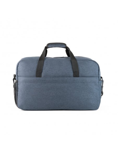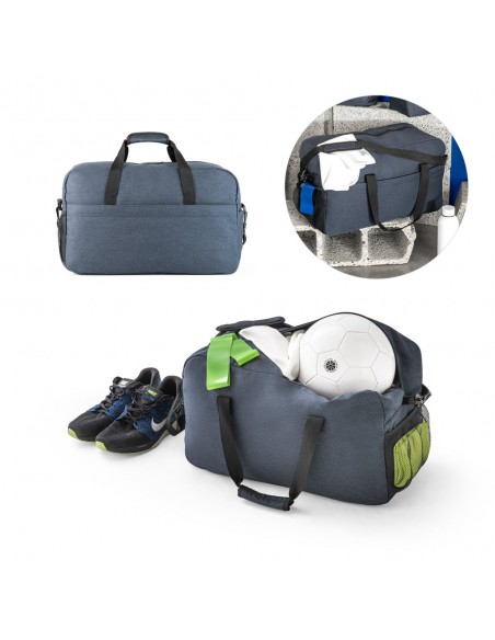 Bolsa esportiva em rPET 600D com interior forrado e fundo com placa semi-rígida.