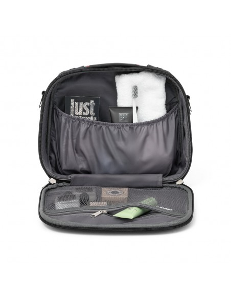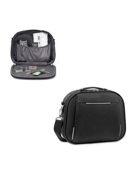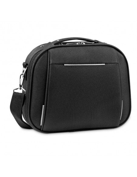 Mala de cosméticos em 600D e EVA com fecho duplo. Compartimento frontal semi-rígido e interior forrado com 2 bolsos. A mala tem uma banda para transporte em trolley de viagem e alça ajustável em webbing.