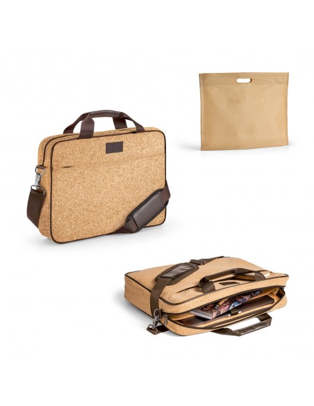 Pasta para notebook em cortiça. Compartimento forrado e almofadado, com divisória para notebook até 15.6''. A pasta tem um bolso frontal e alça de ombro ajustável, com reforço almofadado. Fornecida em embalagem de non-woven.