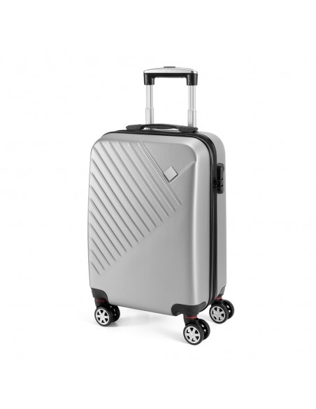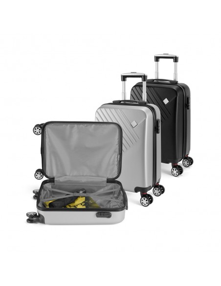 Mala de viagem executivo em ABS com interior forrado, com divisória. Fecho de segurança com senha na lateral, 4 rodas duplas giratórias, pega extensível em metal, com mola (altura pega estendida até 520 mm) e placa metálica removível, para fácil gravação. A mala tem capacidade até 37 L e peso de 2,50 kg.