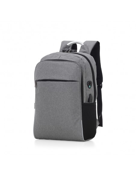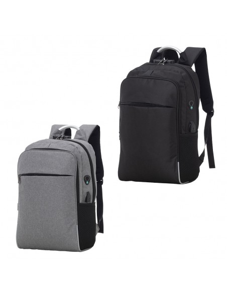 Parte externa: Fechamento por cadeado com senha, alça de mão em metal, alça de ombro acolchoada, 2 bolsos frontais, 2 bolsos laterais, mini bolso na alça de ombro, conector USB na lateral, saída para fones de ouvido na lateral.