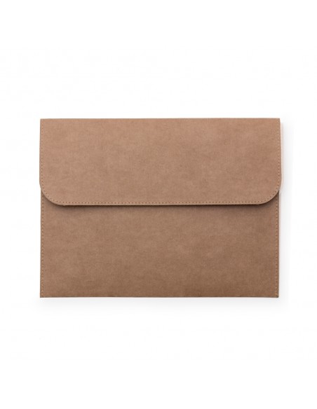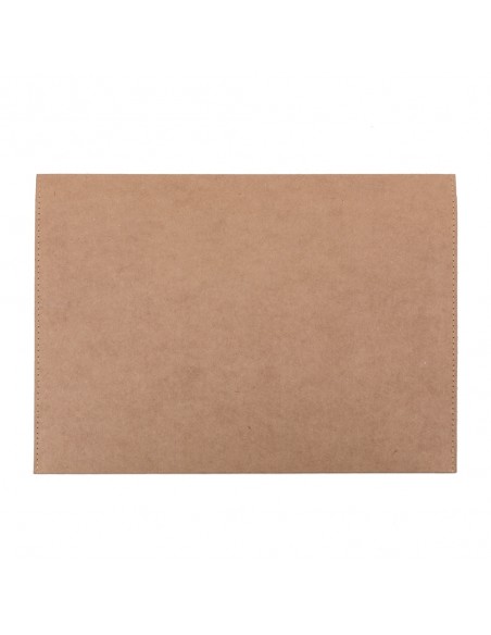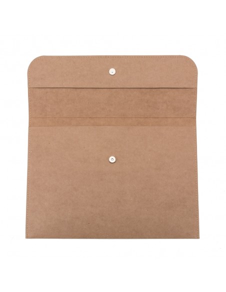 Pasta envelope ecológica, possui abertura superior fixada por um botão imãtizado. Detalhes costurados nas laterais, material em kraft.