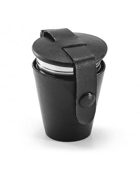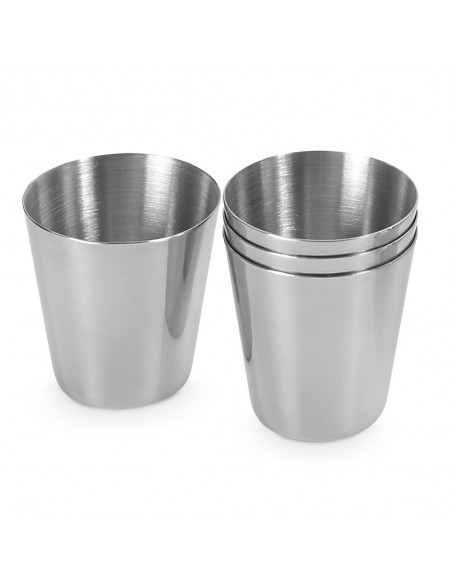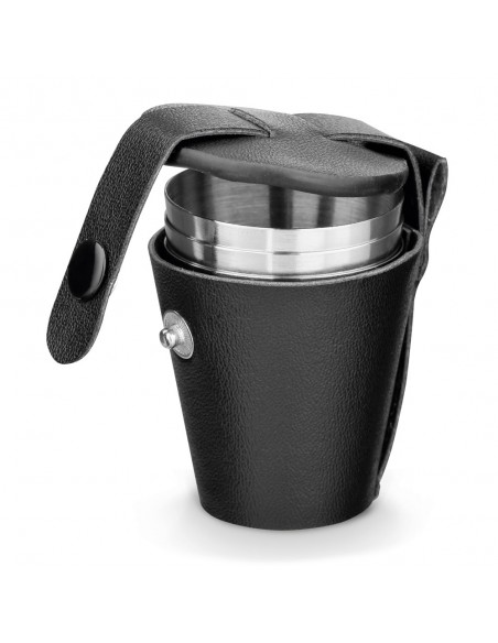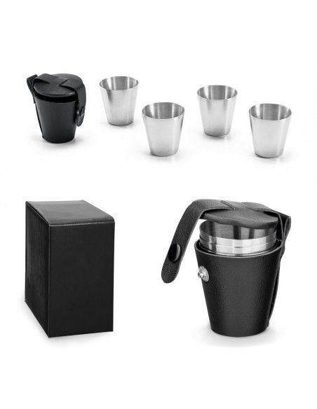 Conjunto de 4 copos em aço inox com bolsa para transporte em imitação de pele e com capacidade até 25 mL. Food grade. Fornecido em caixa de oferta.