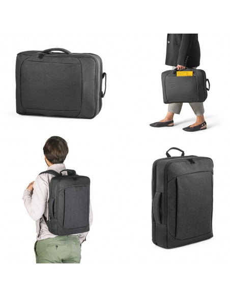 Mochila híbrida (2 em 1) em 600D com 2 modos de transporte. Possui um modo mochila, com parte posterior e alças almofadadas com mecanismo que permite ocultá-las. Também pode ser utilizada em modo pasta, com uma pega de mão reforçada e confortável.