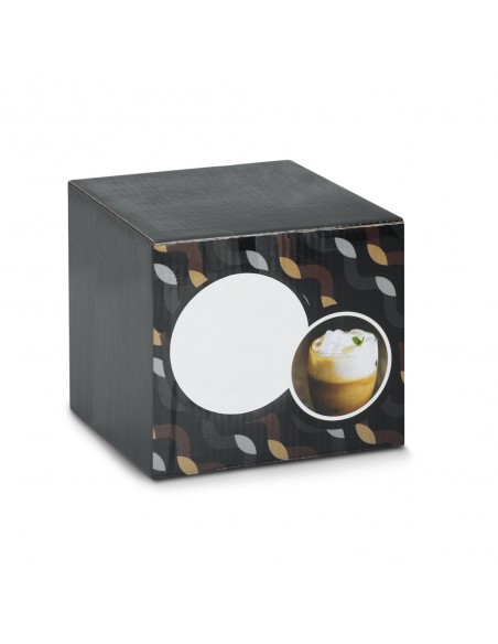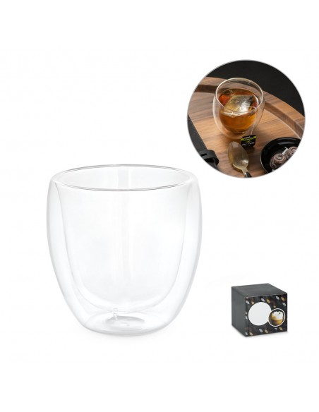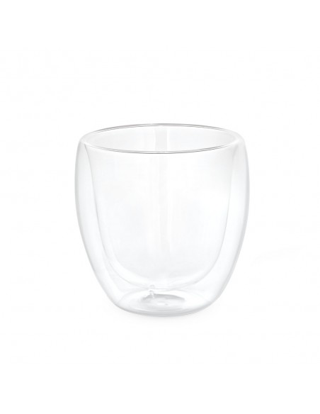Copo de vidro isotérmico com parede dupla isolada a ar e capacidade até 220 mL.