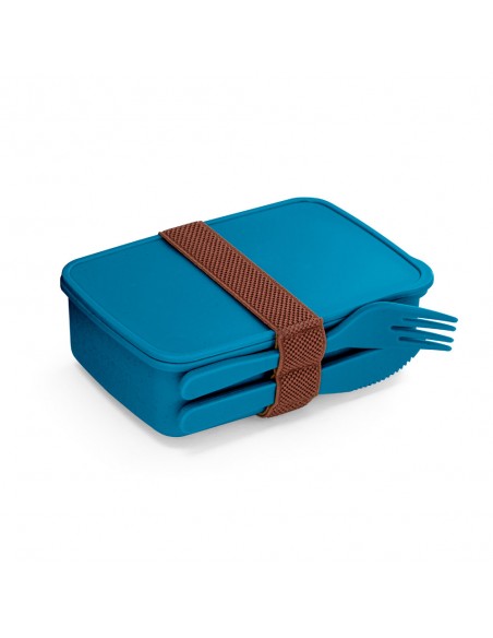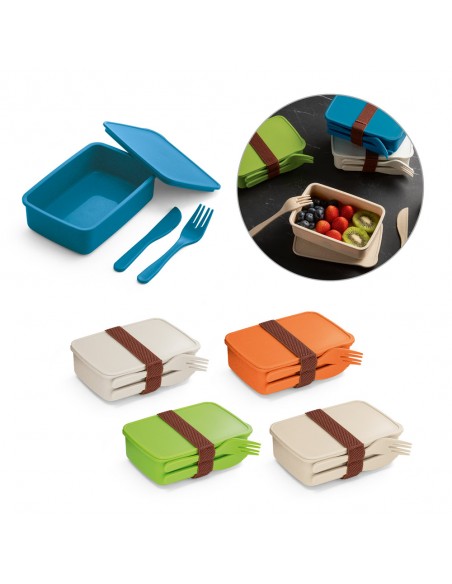 Marmita hermética em fibra de bambu (50%) e PP (50%) com compartimento com capacidade até 600 mL. Contém banda elástica com suporte para 2 talheres, inclusos: garfo e faca. Apto para microondas (retirar a tampa).