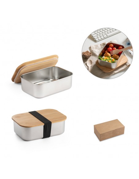 Marmita em aço inox e tampa em bambu com banda elástica para um transporte mais seguro.
