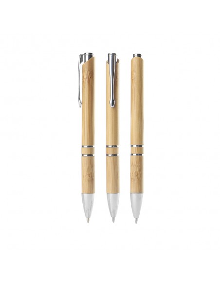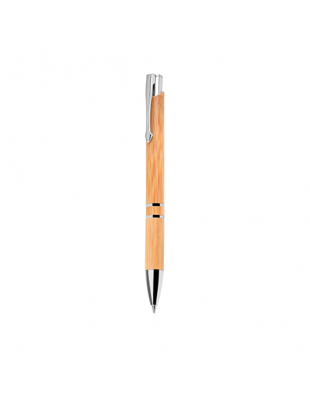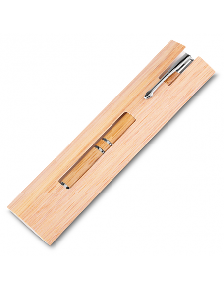 Caneta corpo de bambu com detalhes em metal. Acompanha estojo de papel bambu print.