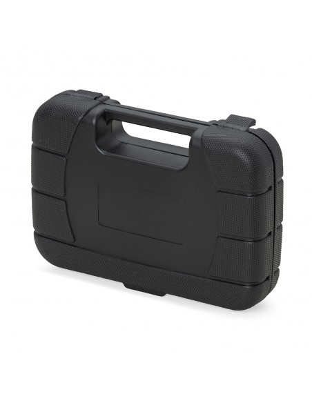 Kit ferramenta 8 peças em estojo plástico. Maleta plástica com detalhe retangular no centro frontal e verso liso, possui texturização no estojo e duas travas superiores. Acompanha: fita isolante, martelo, alicate, chave Philips, chave teste, chave de fenda, trena 2 metros e estilete.