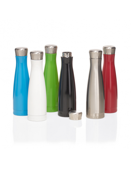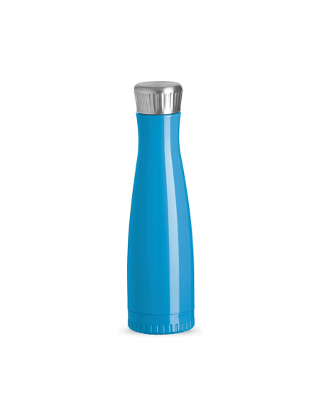 Garrafa em aço inox com capacidade de até 700 ml. Tampa rosqueável com anel de silicone para vedação.