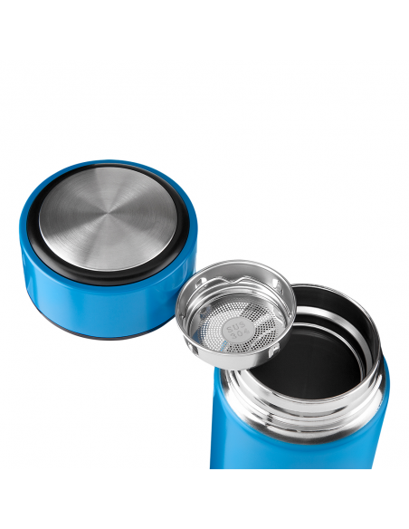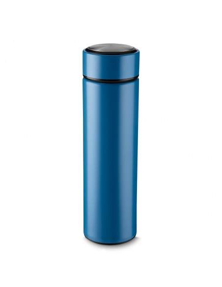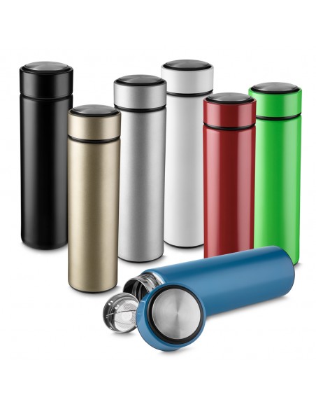 Garrafa térmica em aço inox com parede dupla isolada a vácuo, com capacidade de até 500 ml.