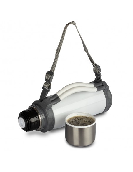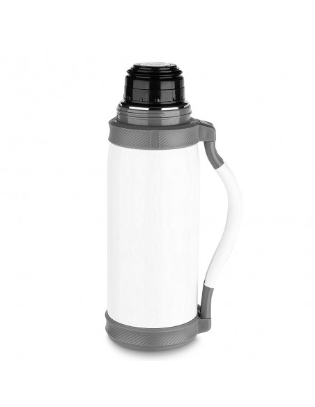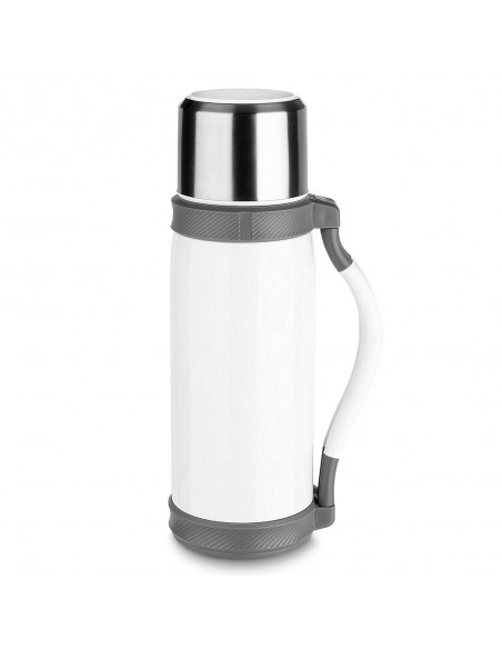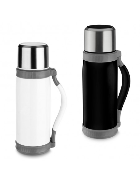 Garrafa térmica com capacidade de 1 litro em inox com parede dupla.