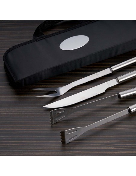 Kit Churrasco 9 Peças em estojo de nylon com alça. Contém: pegador, garfo, espátula, faca, pincel e 4 espetos. Utensílios de inox com proteções plásticas e parte interna com velcro para fixação das peças, acompanha plaquinha metálica para personalização.